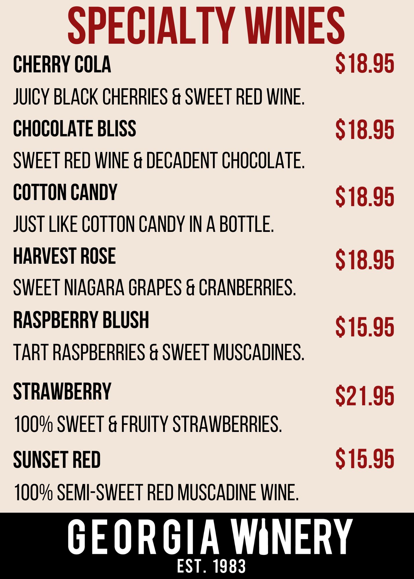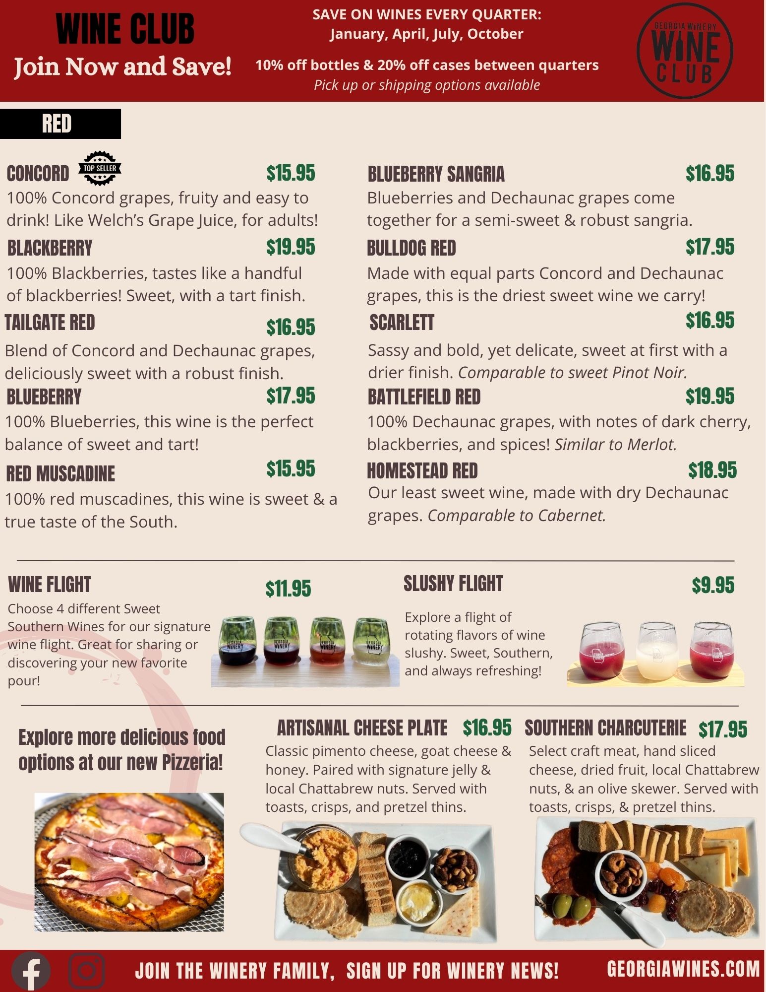 Sips, Snacks & Southern Charm. Unwind with a glass of your favorite Sweet Southern Wine and a house-made appetizer, perfect for sharing with friends. Take in the relaxing views from our tasting room, indoor lounge, or covered patio—now open and ready to welcome you!
