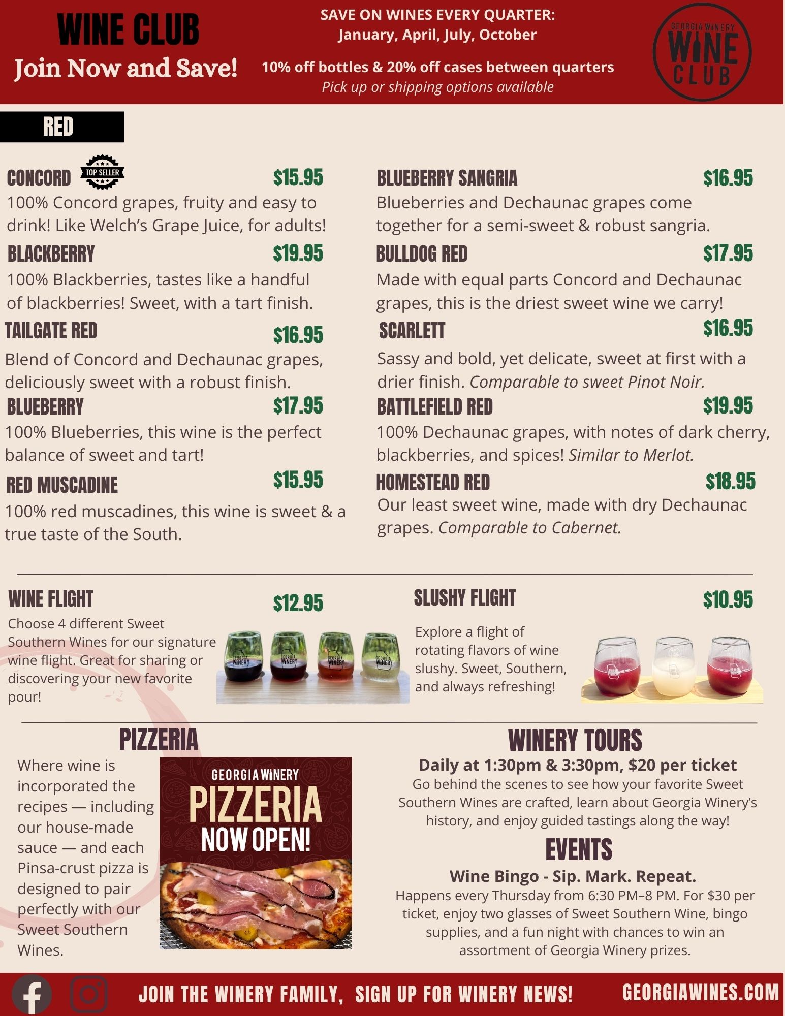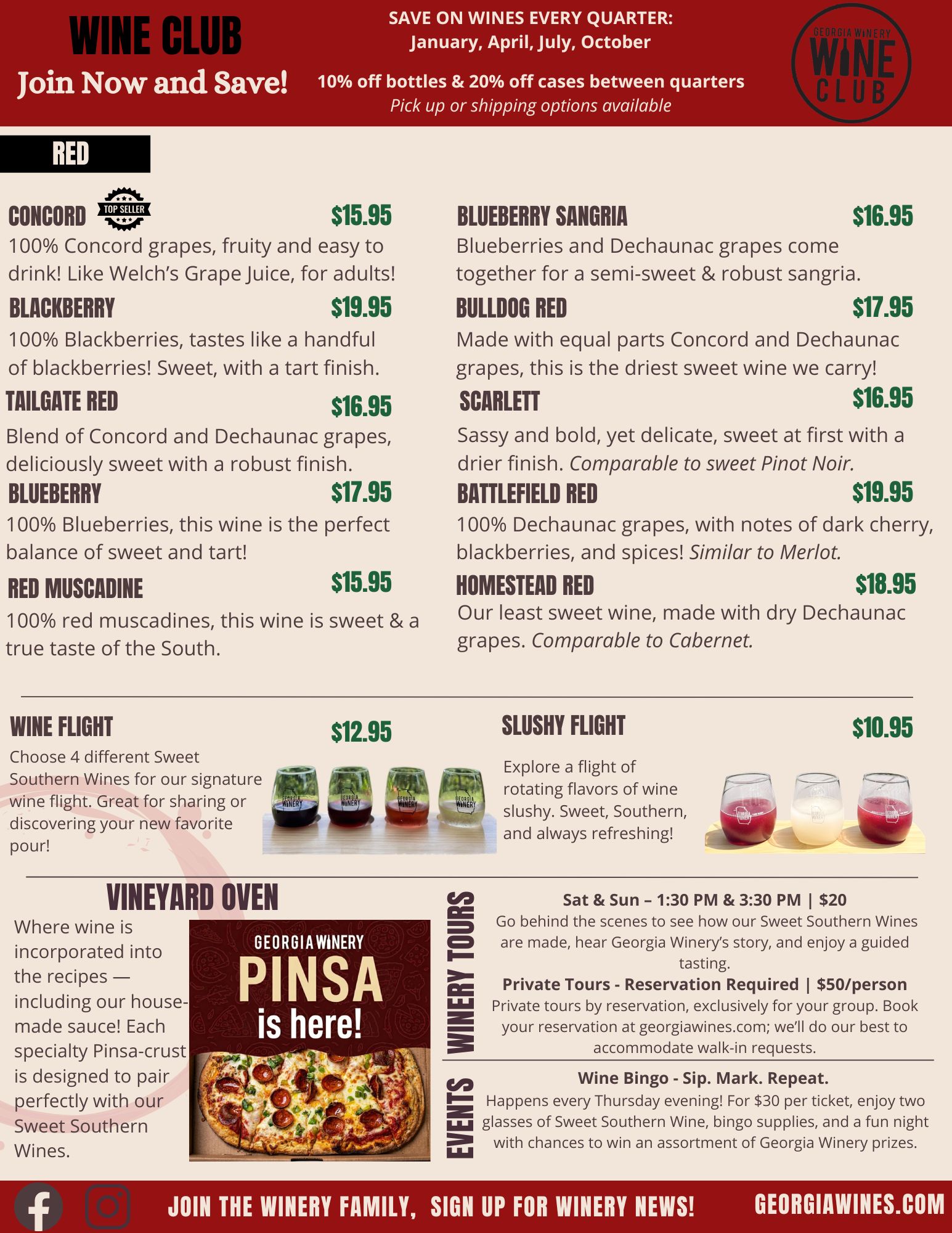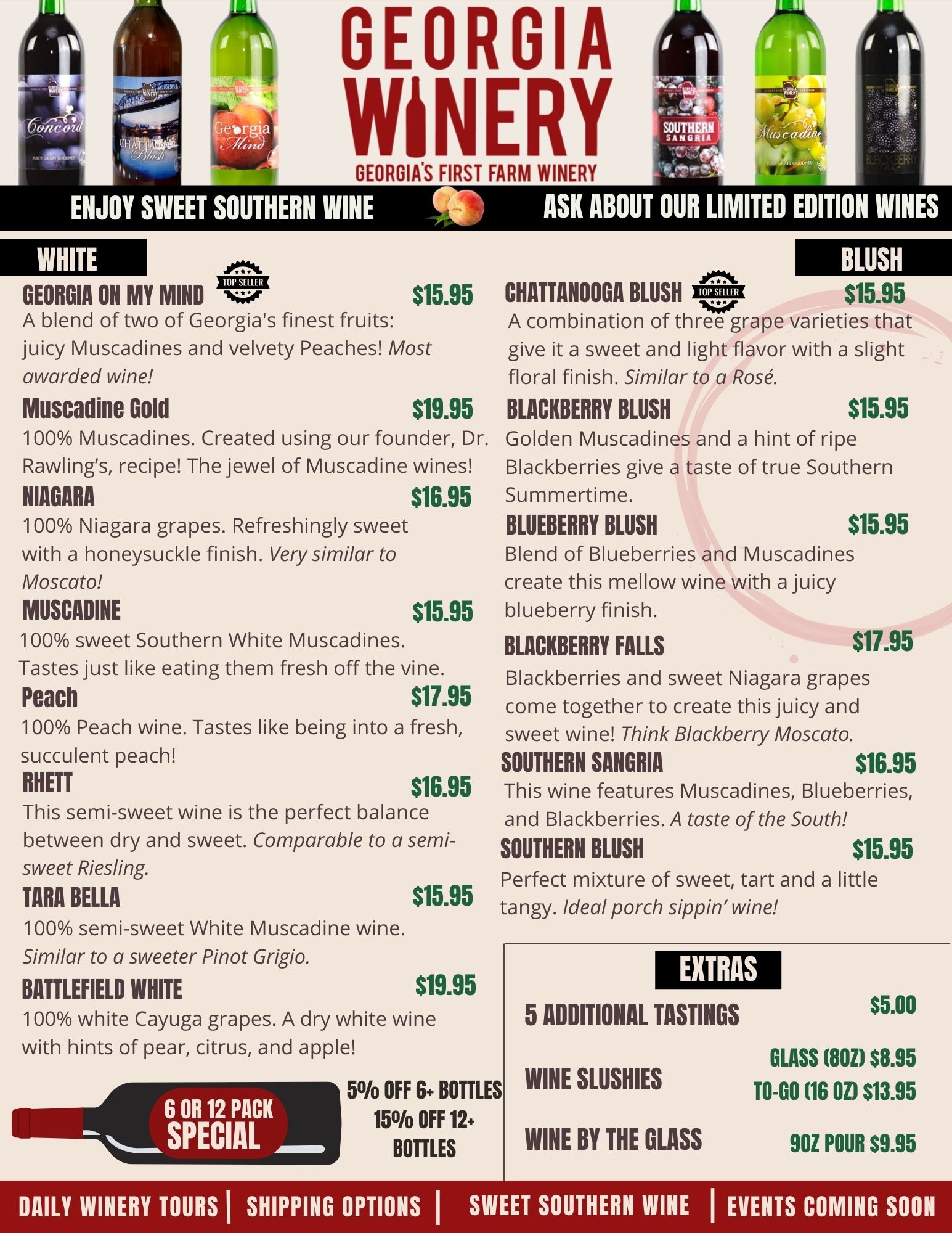 Sips, Snacks & Southern Charm. Unwind with a glass of your favorite Sweet Southern Wine and a house-made pizza, perfect for sharing with friends. Take in the relaxing views from our tasting room, indoor lounge, or covered patio—now open and ready to welcome you!